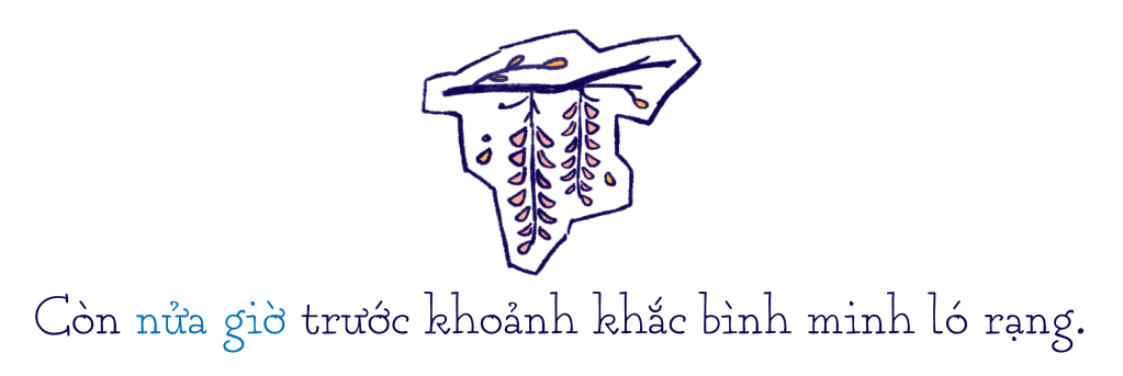 Những vì sao lấp lánh trên bầu trời đêm đang mờ dần. Ánh lửa trong lò sưởi đã tắt lịm, chỉ còn lại những đốm than hồng le lói giữa tàn tro. Màn đêm chìm vào tĩnh lặng.