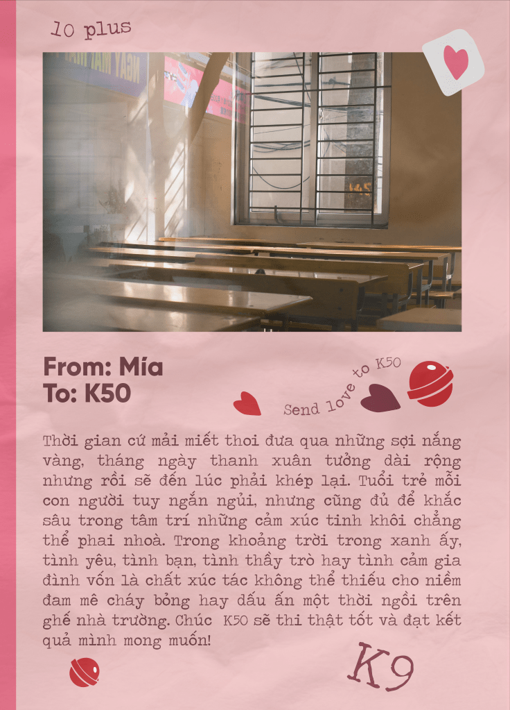 Cuối cùng thì, đối mặt với kỳ thi phía trước, chúng em xin chúc các anh chị K50 ôn tập thật tốt và đạt được kết quả như mong đợi. Dù bước trên lộ trình nào đi chăng nữa, chúng em mong anh chị sẽ luôn tự tin với quyết định của mình và gặp được thật nhiều may mắn. Hy vọng rằng, Chuyên Ngữ sẽ mãi là chỗ dựa tinh thần, là nguồn động lực lớn để anh chị không ngừng cố gắng theo đuổi tương lai phía trước.
