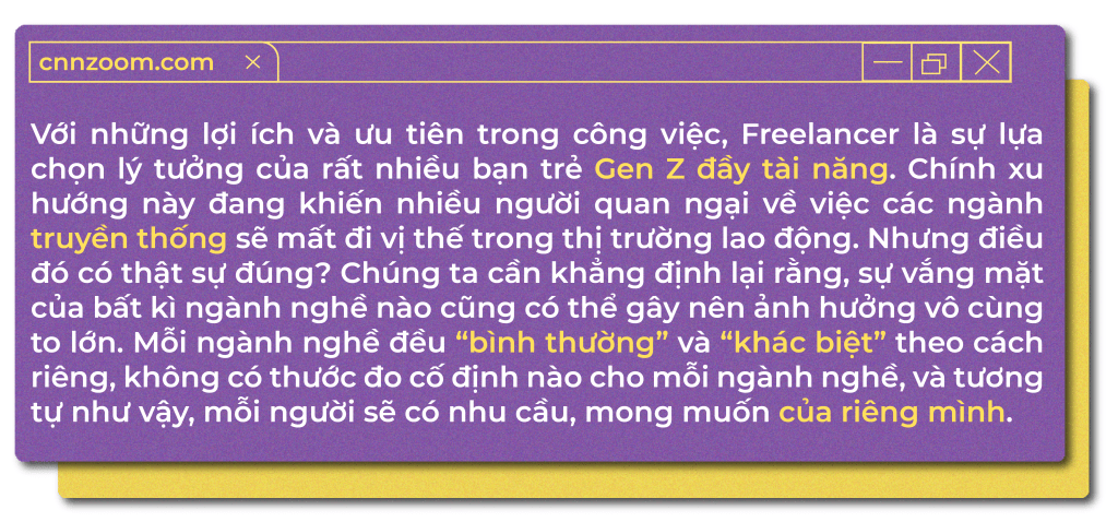 Nhìn vào xã hội hiện nay, khi có vô số bạn trẻ thành công trong lĩnh vực Freelance và nhanh chóng đưa nghề này trở thành một trào lưu được nhiều người theo đuổi, quả thật không ngoa khi khẳng định rằng, tuy Gen Z có phong cách làm việc phóng khoáng, không có giới hạn, họ vẫn là những người có nguyên tắc riêng. Có thể nói, sự quy củ và khả năng tự quản lý bản thân mặc dù là trở ngại không nhỏ, nhưng cũng đồng thời là chìa khóa để mỗi bạn trẻ thuộc thế hệ này đứng vững trên chính đôi chân mình và thành công với vai trò Freelancer.