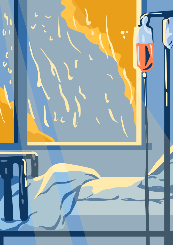Giữa cái sảnh bệnh viện đầy tang thương ấy, người mẹ ngồi lọt thỏm giữa hàng ghế chờ dài như bất tận, đưa mắt nhìn ra cửa sổ với ánh nhìn xa xăm ẩn chứa đầy hy vọng. Mẹ cứ trông, cứ ngóng về một nơi nào tưởng chừng xa xôi lắm, mẹ vươn đôi vai hao mòn của mình mỗi khi có mấy chiếc xe to sơn màu trắng đỏ thi nhau còi hú trước cổng bệnh viện. Phải, mẹ đang mãi ngóng một cơn mưa, cơn mưa có thể gột bỏ những lo toan và gợn buồn trong trái tim đã kiệt quệ của mình.