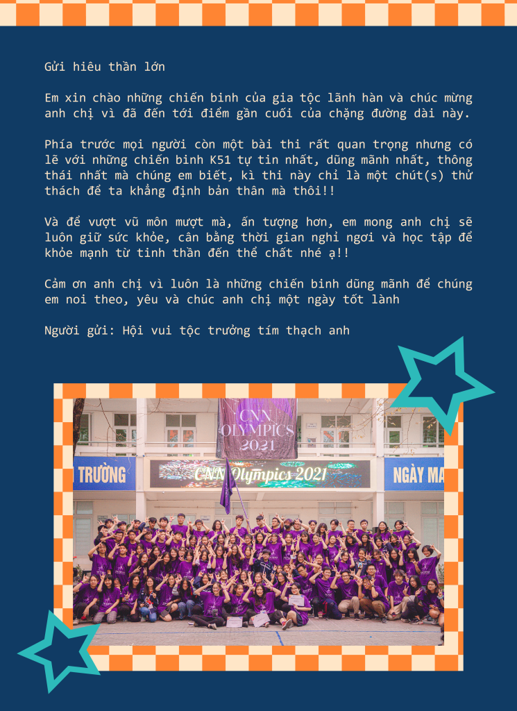 Chờ đợi anh chị phía trước là kỳ thi Đại học đầy cam go. Mong rằng những hồi ức đẹp đẽ dưới khoảng trời hình chữ nhật sẽ tiếp thêm cho anh chị sức mạnh để đạt được kết quả mình mong muốn và tỏa sáng trên mọi chặng đường sau này.