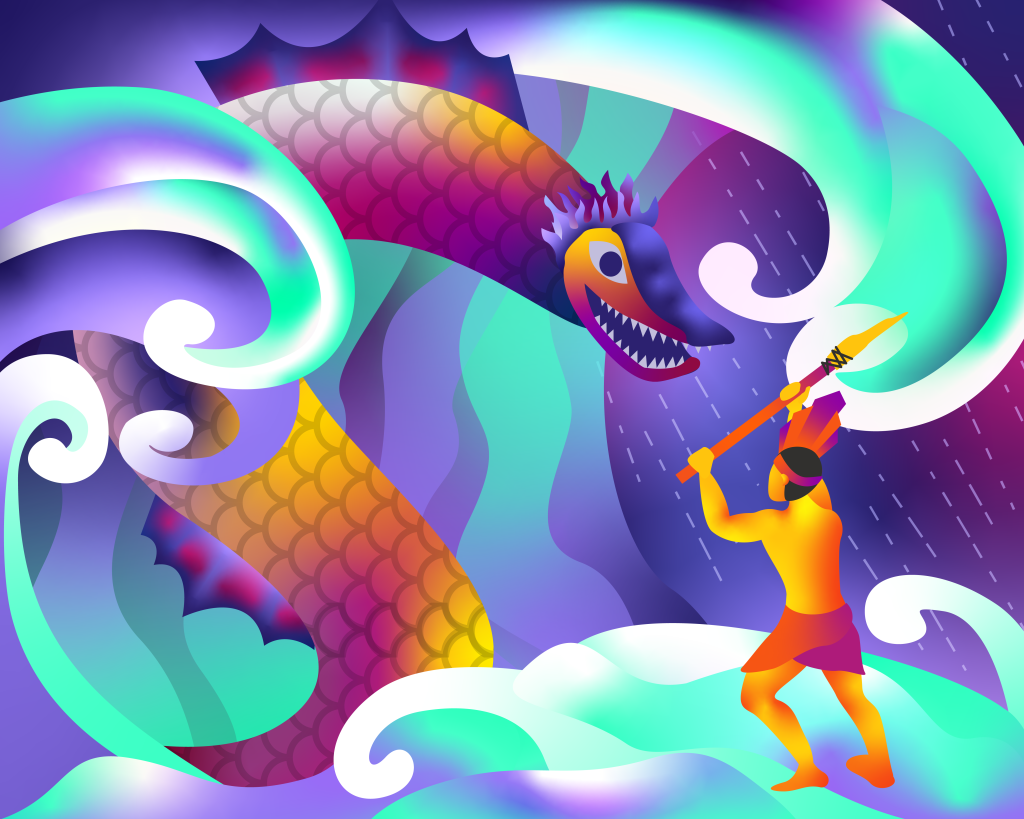 “Thuở xa xưa, biển cả xuất hiện loài Ngư Tinh hung tàn, ngày ngày dâng nước lũ lên cuồn cuộn hòng phá hoại cuộc sống vốn yên bình của bộ tộc Lạc Việt. Một vị lạc thần vì cố gắng cứu người dân cũng bị Ngư Tinh quật cho gục ngã. Bất bình, một vị thần dũng mãnh khác đi tuần ngang qua vùng biển dữ quyết ra tay diệt trừ ác tinh để trả lại ấm no cho người dân. Thần giả vờ làm mồi nhử, dụ Ngư Tinh trỗi dậy giữa sóng yên biển lặng. Để rồi sau trận chiến thắng đó, người dân Lạc Việt liền nhận hai vị thần làm thủ lĩnh, quyết trung thành tuân theo sự lãnh đạo của hai người cho đến hơi thở cuối cùng. Cháu của bà có thấy quen không? Hai vị thần ấy chính là ngài Lạc Long Quân và nàng Âu Cơ, tổ tiên của dòng tộc Việt anh hùng đó.”