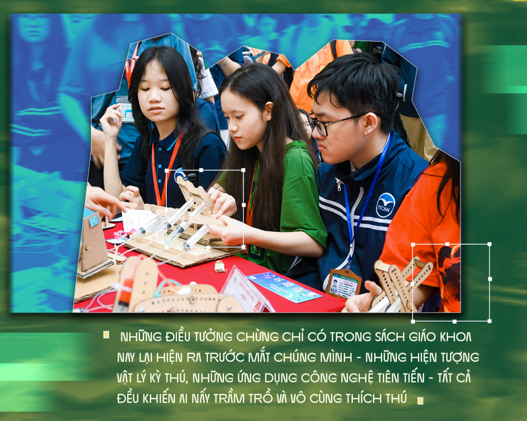 Khi những tia nắng ấm áp chiếu xuống rọi sáng mặt đất cũng chính là lúc sân trường trở nên náo nhiệt hơn bao giờ hết. Lúc này, các trại trải nghiệm thí nghiệm tự nhiên cũng đã sẵn sàng tiếp đón những nhóm học sinh đang nườm nượp kéo đến. Những điều tưởng chừng chỉ có trong sách giáo khoa nay lại hiện ra trước mắt chúng mình – những hiện tượng vật lý kỳ thú, những ứng dụng công nghệ tiên tiến – tất cả đều khiến ai nấy trầm trồ và vô cùng thích thú.
